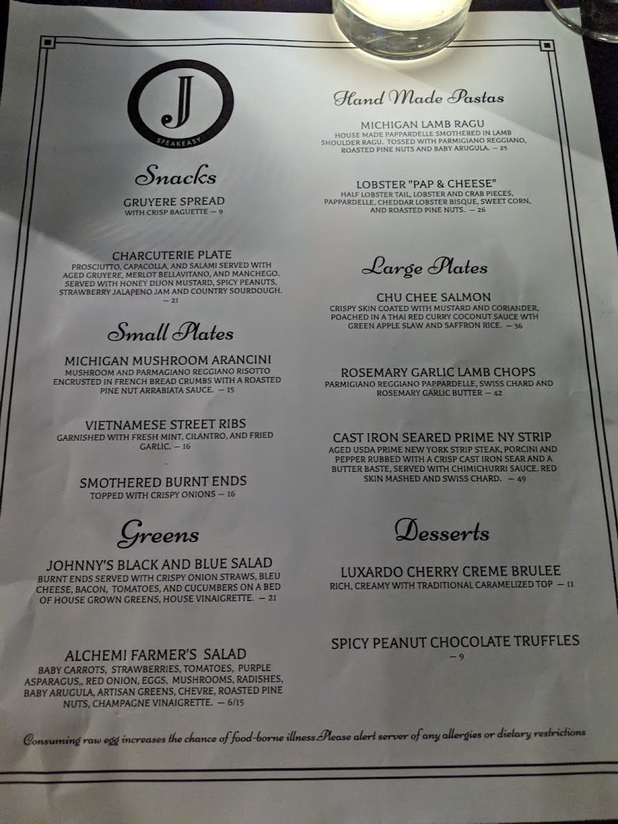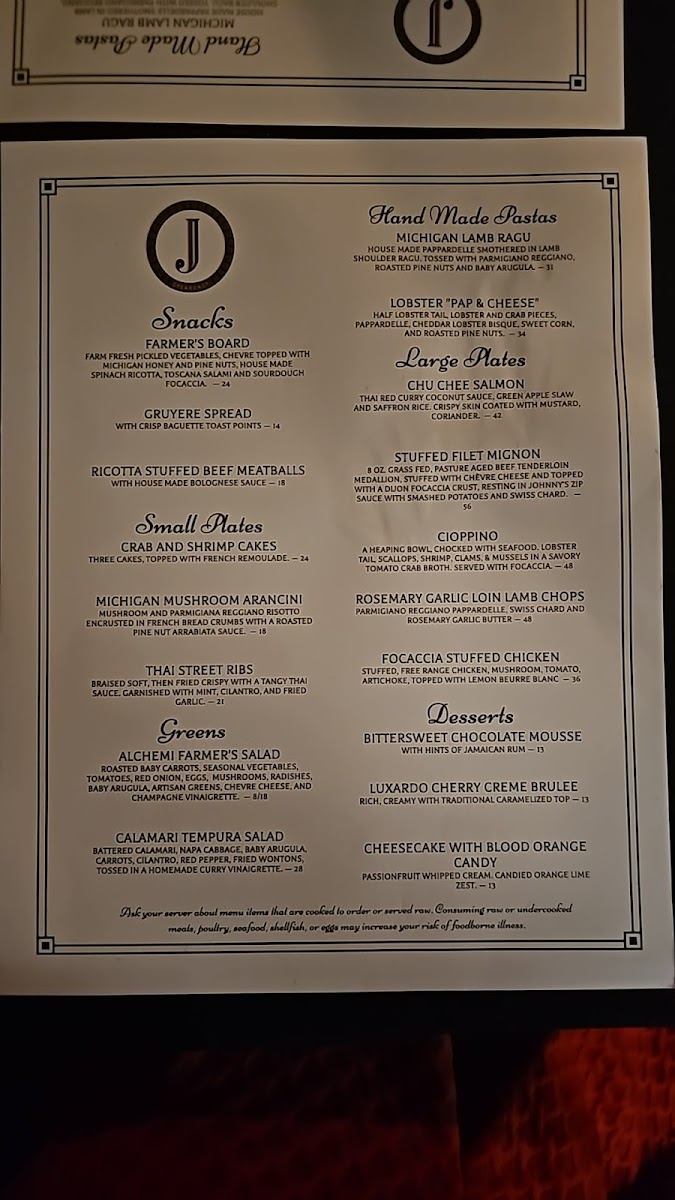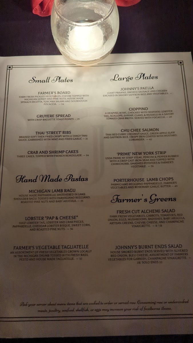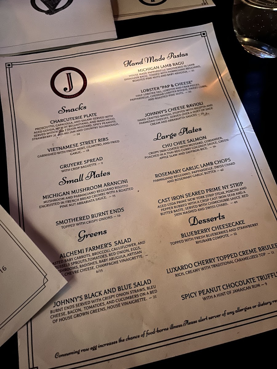 Johnny's menu is a delightful journey through gourmet cuisine. Indulge in handmade pastas like the rich Michigan Lamb Ragu ($31) and the luxurious Lobster "Pap & Cheese" ($34). For meat lovers, the Wagyu Beef Strudel ($65) is a showstopper, while the Thai-style street ribs offer a unique twist. Each dish reflects creativity and quality, with rave reviews highlighting the delicious Gruyere cheese and focaccia appetizer.